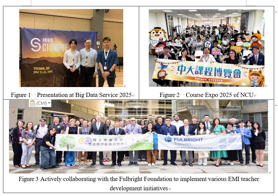 Uedu Leads AI Teaching Innovation Toward New Milestones in International Collaboration: Through the “Uedu” platform, NCU promotes AI-assisted teaching across the university. In 2024, 15 faculty members incorporated it into their teaching practice research projects and completed the development of lesson plans and operation manuals. To date, a total of 487 faculty and students have registered on the platform. NCU also collaborated with seven universities, including NTHU and NYCU, to broaden the impact of AI-assisted teaching in Taiwan, and extended the model to four affiliated high schools (including NCU-affiliated Zhongli Senior High School and NTNU High School). These efforts strengthen K–12 and higher education collaboration by leveraging generative AI and learning analytics to realize data-driven instructional models. In 2025, related research received an award at ICALT and was further showcased at the Big Data Service Conference (Figure 1), opening new international collaboration opportunities.