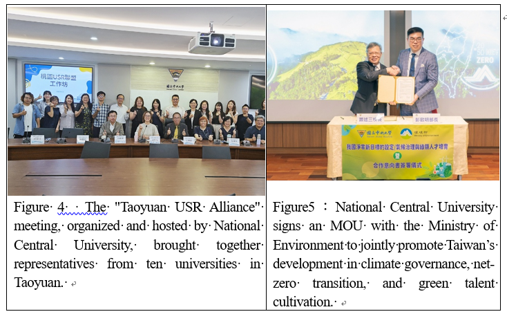 NCU also signed an MOU with the Ministry of Environment (Figure 5) to establish a long-term partnership in climate governance, net-zero transformation, and green talent cultivation. By leveraging academic expertise to drive social transformation and incorporating social responsibility into mid- to long-term institutional governance, NCU was honored with the “2025 Taiwan Top 10 Sustainable Model Universities Award,” demonstrating outstanding achievements in sustainable development and social responsibility.