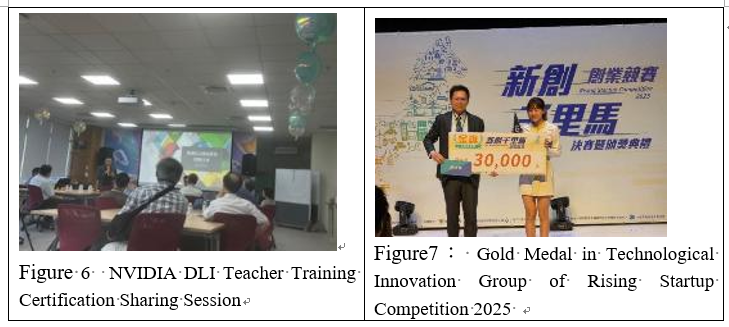 NCU has strengthened AI education by formally launching the NVIDIA Deep Learning Institute (DLI) faculty training program and earning official NVIDIA Campus Ambassador certification, with seven faculty certified to date. An “NVIDIA DLI Experience-Sharing Session” (Figure 6) was held to build campus AI teaching communities and industry pipelines. In collaboration with the semiconductor industry, specialized courses were launched, with 15 master’s and 42 bachelor’s students currently participating in related modules and STEM graduate programs.