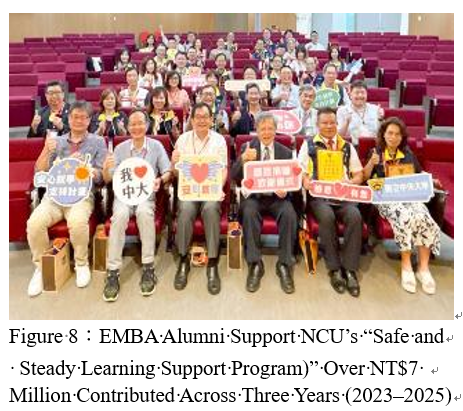 Over the past three years, the proportion of students receiving assistance increased from 2.84% in AY 2023 to 3.46% in AY 2025. In addition to financial aid, diverse counseling encourages “learning instead of part-time work.” The EMBA Alumni Association donated over NT$7 million for three consecutive years (Figure 8), becoming a key pillar. The University also launched small-donation campaigns and held 10 public-benefit lectures/donated courses, with supported students serving as TAs and volunteers, fostering service learning and spreading goodwill on campus.
