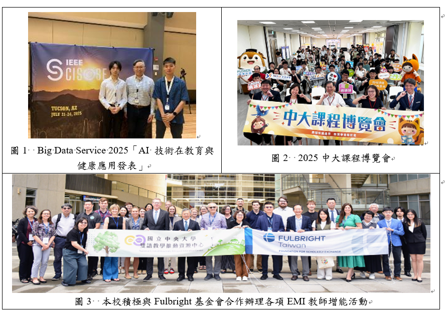 從創新到實踐,打造教師專業成長生態圈:本校以教學實踐研究計畫為核心,建立教師從教學創新到研究實踐的支持機制,透過課程培訓、TA補助與成果追蹤,推動教師持續精進。114學年度共有29位教師獲補助,通過率達60.42%,3位計畫教師同時榮獲112學年度教育部全國計畫績優獎勵。自114年度起導入課程學習成效測量,結果顯示學生課程後在學習動機、學習參與、專業知識與技能、跨域整合、問題解決與自主學習六面向的表現均有明顯進步。優學院引領AI教學創新,邁向國際合作新里程:本校以「優學院(Uedu)」為平台推動AI輔助教學,114年度共有15位教師導入實踐研究計畫,完成教案與操作手冊建置,全校累計已有487位師生註冊平台。與清華大學、陽明交通大學等7所大專院校合作課程,共同擴大AI輔助教學在臺灣教育的影響力,同時推展至本校附屬中壢高中、台師大附中等4所高中,促進K12與高教協作,結合生成式AI與學習分析,落實數據導向的教學模式。2025年於ICALT發表論文並獲獎,並於Big Data Service大會展現跨域研究成果(圖1),促成國際合作新契機。探索跨領域學習不只一條路:本校舉辦首屆「中大課程博覽會」(圖2),匯集跨領域自主學習微課程、微學程、學生社群、XPlorer舊課翻新課程與教學實踐課程等60多個團隊參展,邀請校內外專家學者演講與評審交流,許多學生自主學習團隊在創新專題實作中表現亮眼。例如「肌不可失, ChickMustle」結合AI、遊戲化與商業策略,打造全新健身產業解決方案;「藍衫賊, Gather Town」運用人工智慧提升寫作表達並創作數位繪本,充分展現中大在課程創新與教學實踐上的成果與能量。Fulbright合作深化EMI教學與國際競爭力(圖3):本校與Fulbright基金會合作於異地辦理二天一夜EMI教師增能研習營,由海外EMI專家學者與本校具卓越表現之教師共同授課,深化教師EMI教學法應用能力;並成立六組EAP/ESP跨領域課程共備教師社群,透過大一英文課融入工程、科技、管理與人文等專業領域的英語先備知識,強化學生基礎能力與後續學習銜接,促進英語授課資源共享與國際化課程品質精進。此系列措施持續透過教師EMI教學強化學生國際移動與跨文化溝通能力,提升其在全球化學習與職場環境中的競爭優勢。