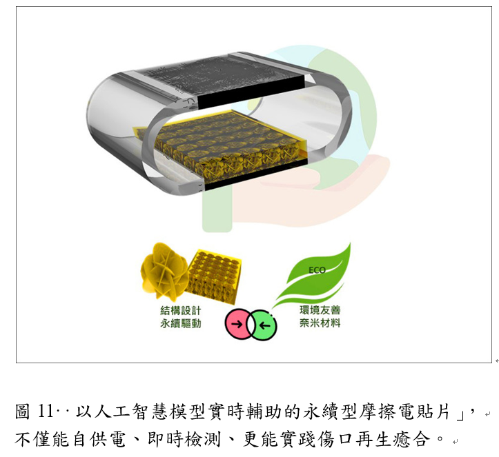 本領域與中大聯新聯合慢性病研究中心合作,聚焦癌症、心血管及神經精神疾病等跨域研究。團隊在基因機制與疾病關聯方面取得重要進展,揭示Thg1基因突變與小腦萎縮之關聯性可能涉及tRNA修飾異常,證實PFOS長期暴露促使泌尿道癌細胞惡化,並發現硒胺酸可抑制神經母細胞瘤生長並解析KLF4-CDKN1A調控機制。在精準治療與早期診斷領域,證實Palbociclib可增強放射治療並調節腫瘤免疫微環境,開發RNA分子標記應用於肺癌早期診斷,建構3D腎小管模型鑑定鉛暴露誘導的腎損傷相關miRNAs。智慧醫材與臨床應用成果豐碩,AI輔助永續型摩擦電貼片(圖11),具自供電、即時監測及促進傷口修復功能,成果刊登於《Nano Energy》;建立高密度體表電位重建三維心臟模型技術,實現無輻射冠狀動脈造影與病變定位。此外,認知神經團隊與臺北榮總合作揭示關鍵腦波指標可預測TMS治療憂鬱症成效,成果發表於《International Journal of Clinical and Health Psychology》,並運用密度泛函理論揭示MOF-801節能合成機制,開啟藥物傳輸工程新應用前景。