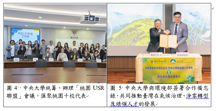 本校對接校務發展主軸「深耕在地,共榮發展」,透過生態環境保育、低碳校園行動與USR教研模式建構,積極推動永續韌性校園與地方協作網絡擴展。114年持續攜手桃園市野鳥協會、荒野保護協會完成校園至周邊社區的生態環教資源盤查,並申請環境部「大專院校辦理淨零綠生活教育計畫」獲63萬補助,推動袋袋相傳、衣起尋寶、低碳飲食、茶鄉走讀、百花川遊程等低碳校園綠行動。在深化公私協力智庫影響力方面,除培力本校USR推動SROI成效衡量機制,亦辦理桃園USR聯盟跨校會議(圖4)、校內USR-Hub徵件作業,共育成3組校內跨系所團隊,奠定中大在韌性社區、地方創生、健康篩檢、食農教育之USR教研模式。本校與環境部簽署合作備忘錄(圖5),建立長期夥伴關係,共同推動氣候治理、淨零轉型及綠領人才培育,深化產官學協作機制,為國家永續發展目標提供學術支持與實踐能量。本校以學術專業推動社會轉型,並將社會責任納入校務治理的中長期規劃,榮獲「2025臺灣十大永續典範大學獎」,展現在永續發展與社會責任實踐上的卓越成果。