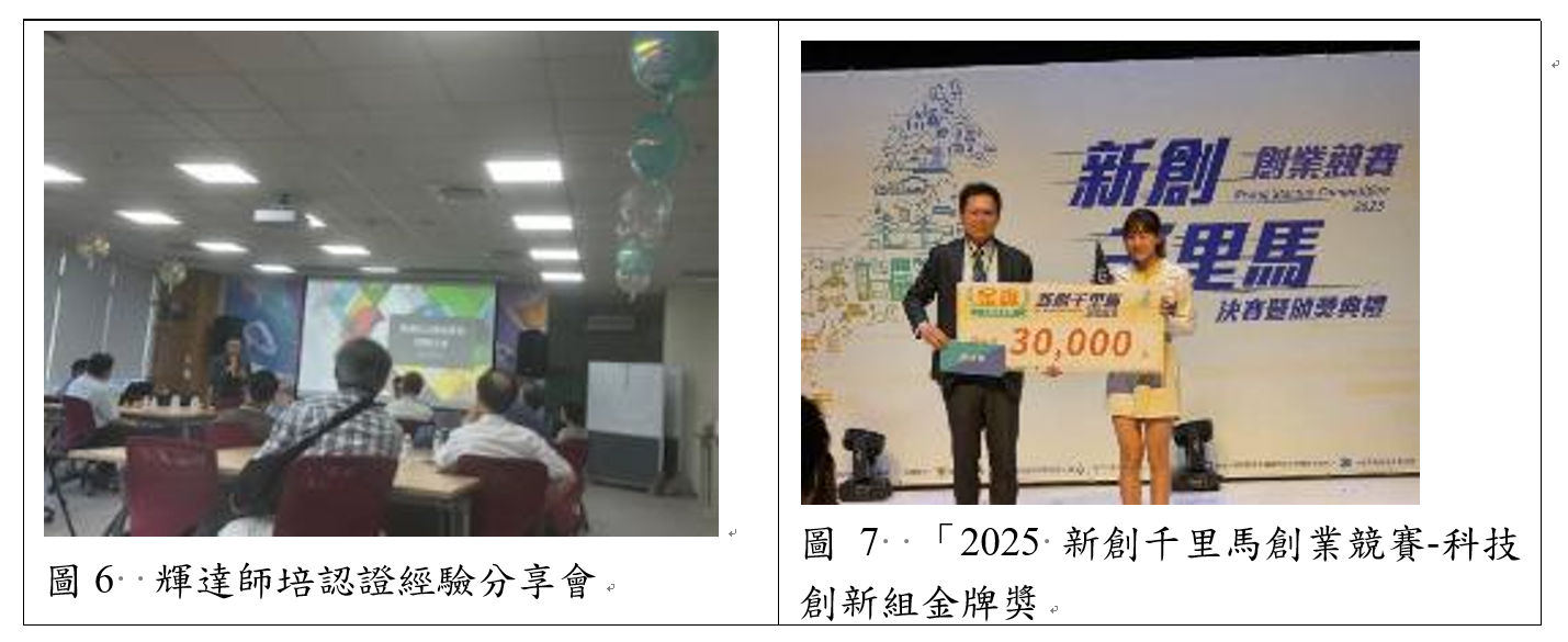 本校透過產業實習、競賽參與、AI教育深化與技術商轉等多元機制,建構完整的產學合作生態系統,培育具實務能力的專業人才並促進研發成果落地應用。各學院積極推動產業實習與競賽參與,鼓勵學生將所學應用於實務與創新挑戰,如富邦金融控股實習、國泰投信實習、經濟部智慧創新大賞及2025新創千里馬創業競賽等,皆展現亮眼成果與專業實踐力。本校深化AI教育推動,正式導入NVIDIA Deep Learning Institute(DLI)師資培訓課程,並取得NVIDIA官方教師校園大使認證,目前已有7位教師通過認證。同時舉辦「輝達DLI師培課程經驗分享聚會」(圖6),建立校內AI教學社群與產學合作管道,促進跨域知識交流與技術共創。此外,與半導體產業合作開設專業課程,培育產業所需人才,並鼓勵學生修讀相關模組及報考本校STEM領域碩士班,目前共有15位碩士班及42位學士班學生參與,展現產學鏈結成果。