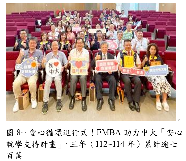 本校透過「安心就學支持計畫」整合校內外資源與積極募款,建構兼具補助、培力與回饋的完整支持系統,逐年擴大對經濟及文化不利學生的支持。近三年受補助學生比例由112年的2.84%成長至114年的3.46%,顯示捐款挹注已實質轉化為更多受惠人次。除經費補助外,亦結合多元輔導措施,鼓勵學生以「學習取代工讀」,提升學習動機與自我成長機會。在尋求外部支持方面,EMBA校友會已連續三年捐助超過七百萬元(圖8),成為計畫的重要後盾。在社區連結上,學校推動「安心就學小額募款」,結合校內優勢與專業資源,邀請教授以公益講座或捐課形式回饋社會,共辦理10場活動。同時,安排安心學生擔任助教,從中學習服務與回饋的價值。此外,安心志工團隊協助課程設計與活動支援,不僅提升學生的行動力與社會實踐能力,也促進善意在校園持續擴散。整體而言,本校已逐步形塑出充分展現推動教育機會均等與落實社會責任的具體成果。